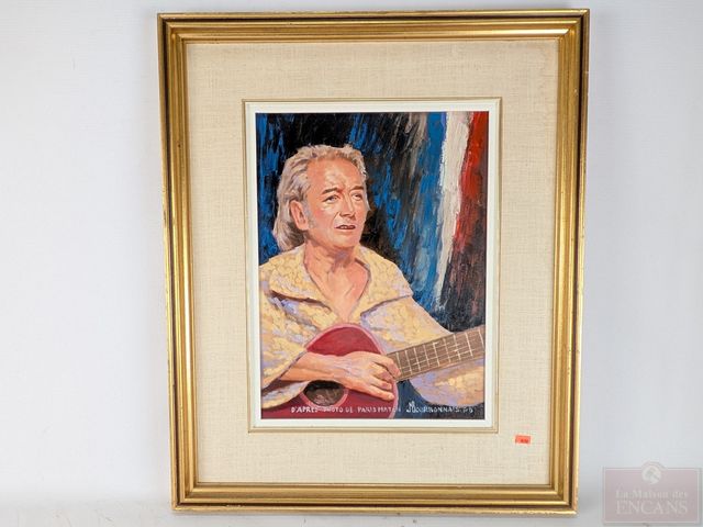 Lot # 15 - Marcel BOURBONNAIS- Huile sur toile signée, représentant un portrait de Félix Leclerc d'après une photo de Paris Match, mesurant 16x12 pouces