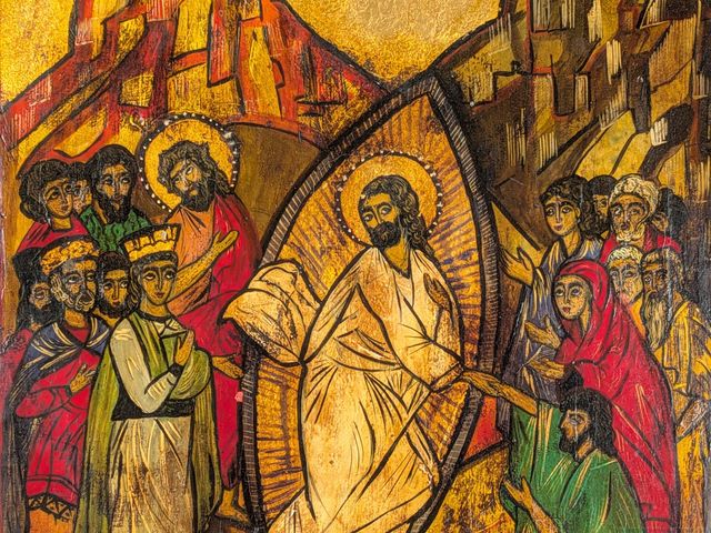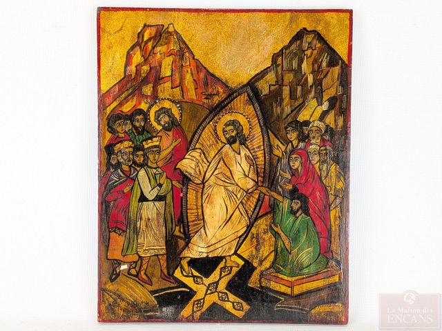 Lot # 12 - Rosette MOCIORNITZA- Icône religieuse peinte à la tempera sur panneau de bois et rehaussée à la feuille d'or, signée à l'endos et mesurant 15.5x12.5 pouces, avec certificat