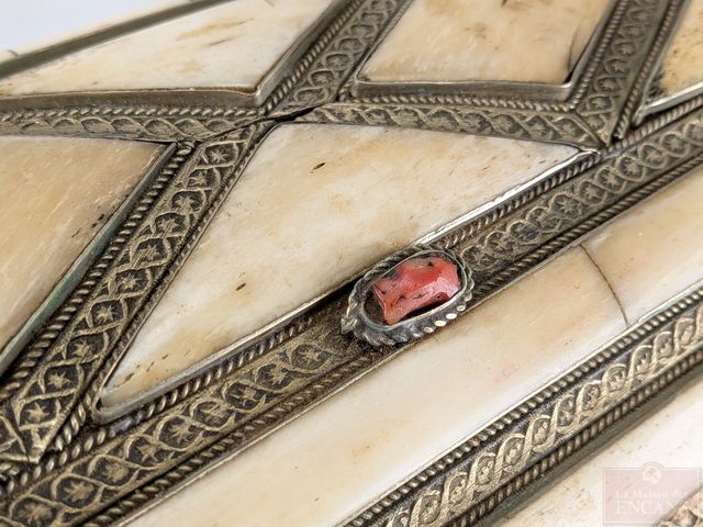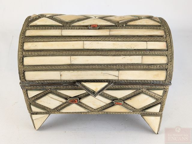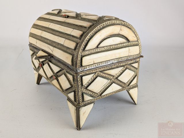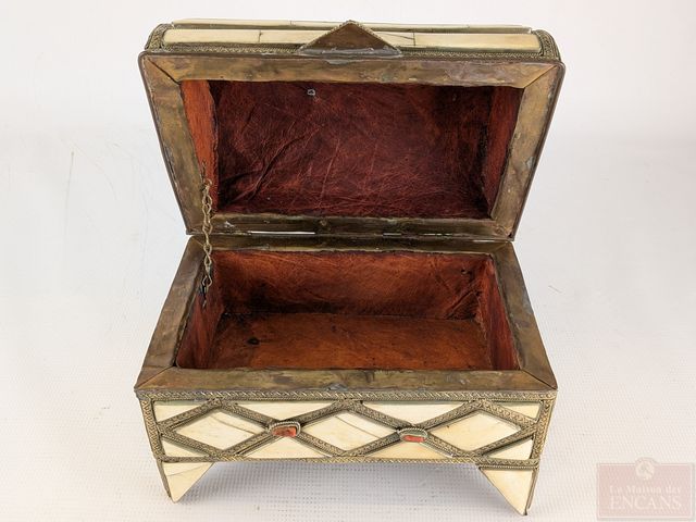 Lot # 44 - Coffre oriental en bois, cuir et laiton serti d'os et de corail, mesurant 10 pouces de largeur