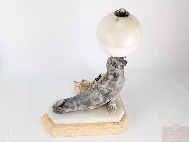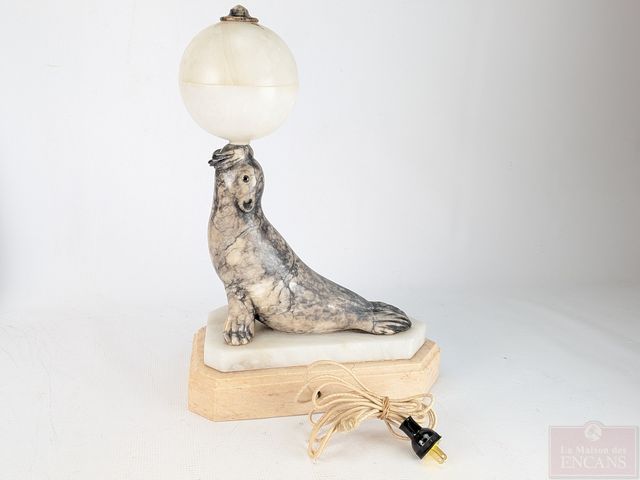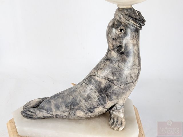 Lampe sculptée sur marbre représentant un phoque jouant avec un ballon, datant des années 1920 et mesurant 17.5 pouces de hauteur