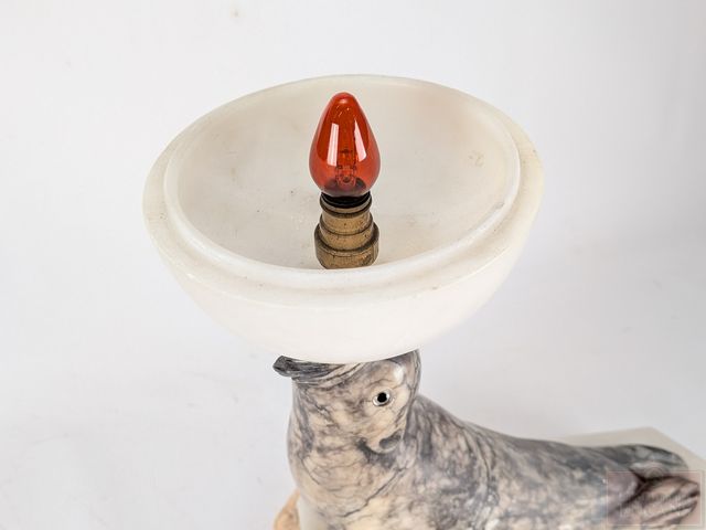 Lot # 118 - Lampe sculptée sur marbre représentant un phoque jouant avec un ballon, datant des années 1920 et mesurant 17.5 pouces de hauteur