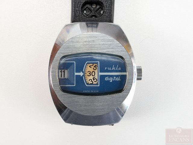 Montre digitale Ruhla en acier inoxydable avec date, faite en Allemagne de l'est, mesurant 38 millimètres avec sa couronne, comme neuve mais mouvement a besoin d'être révisé