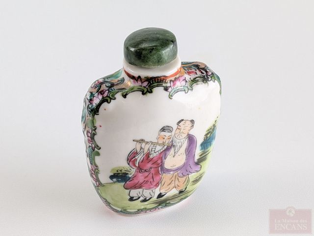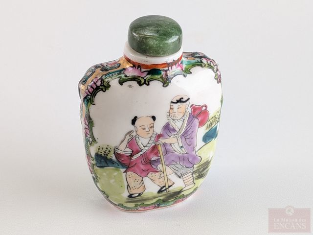 Bouteille à priser orientale peinte à la main sur porcelaine avec bouchon en jade épinard, mesurant 3 pouces de hauteur