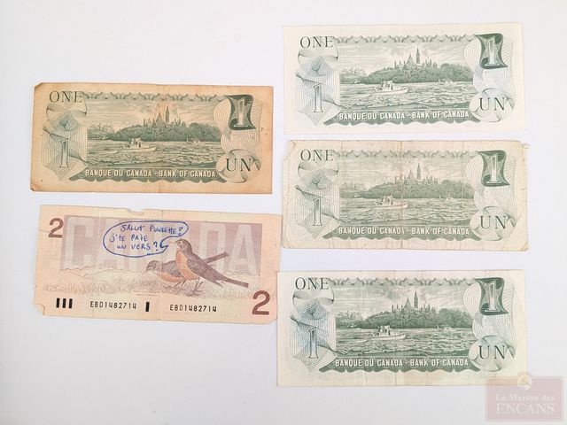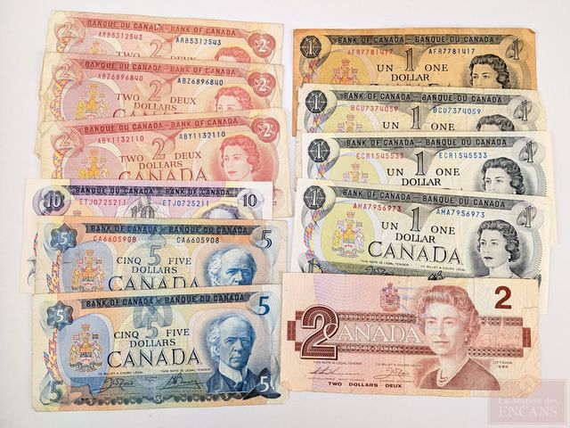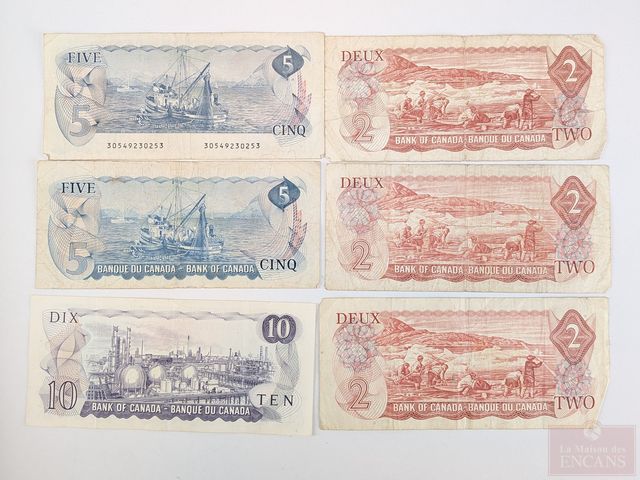 Lot de billets de banque canadiens comprenant billet de dix dollars 1971, billet de cinq dollars 1979, billet de cinq dollars 1972, billet de deux dollars 1986, trois billets de deux dollars 1974 et quatre billets d'un dollar 1973