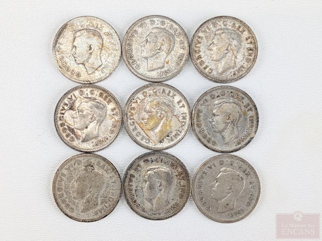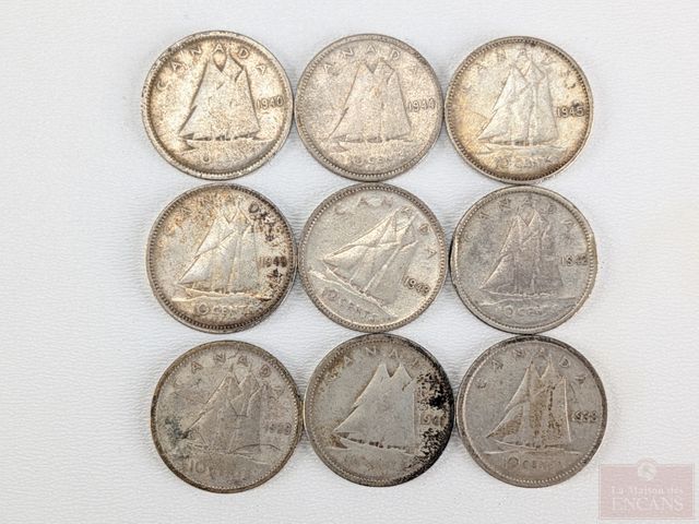 Lot de pièces canadiennes de dix sous en argent, comprenant 1938, 1939, 1940, 1941, 1942, 1943, 1944, 1945 et 1946