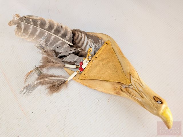 Échiquier africain sculpté sur bois, mesurant 14.5 pouces de largeur, ainsi qu'un porte-bonheur amérindien sculpté sur bois avec plumes, mesurant 14 pouces de longueur