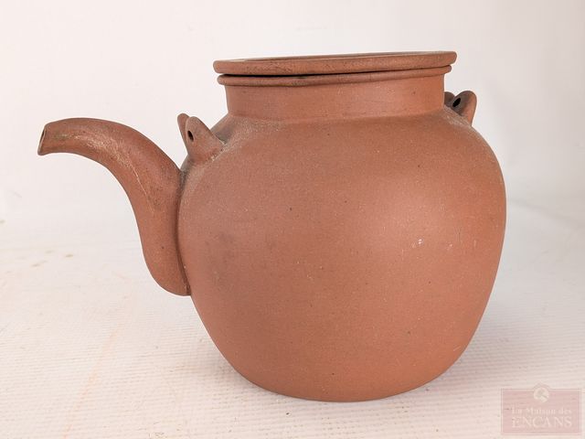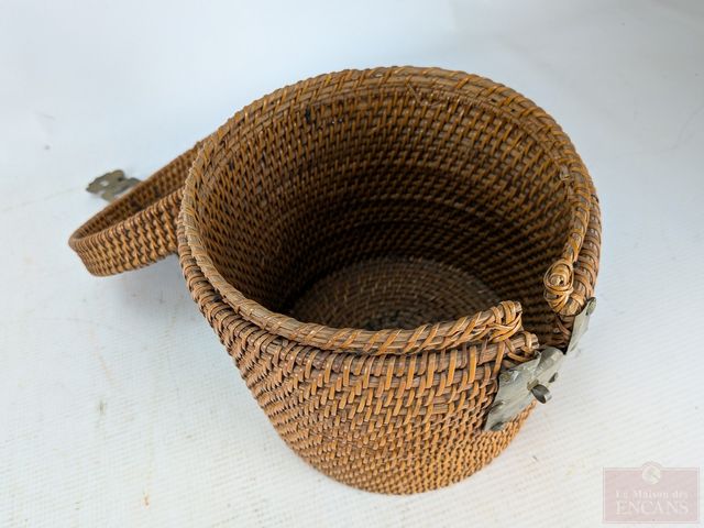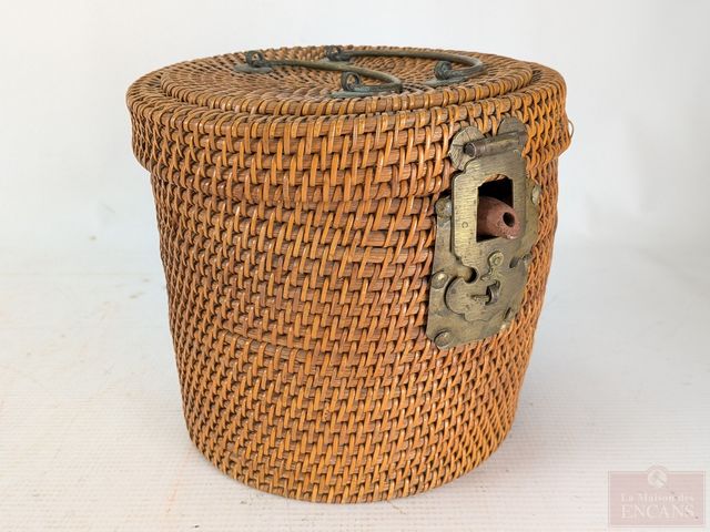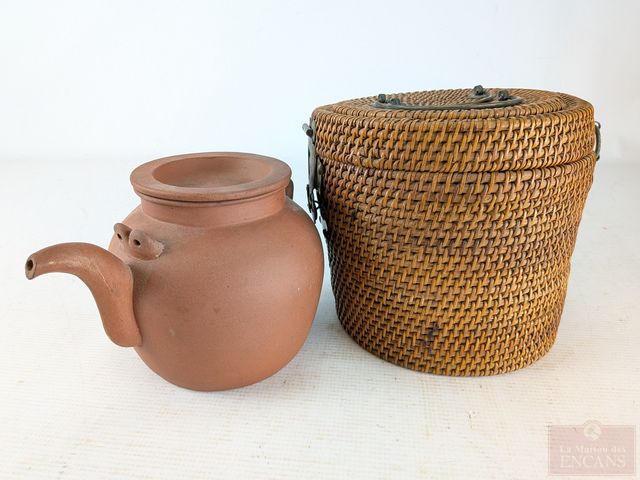 Théière chinoise en terre-cuite avec sceau, dans son panier-coffre verrouillable, tressé à la main et mesurant 7 pouces de hauteur