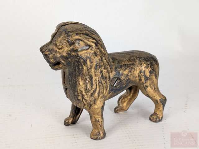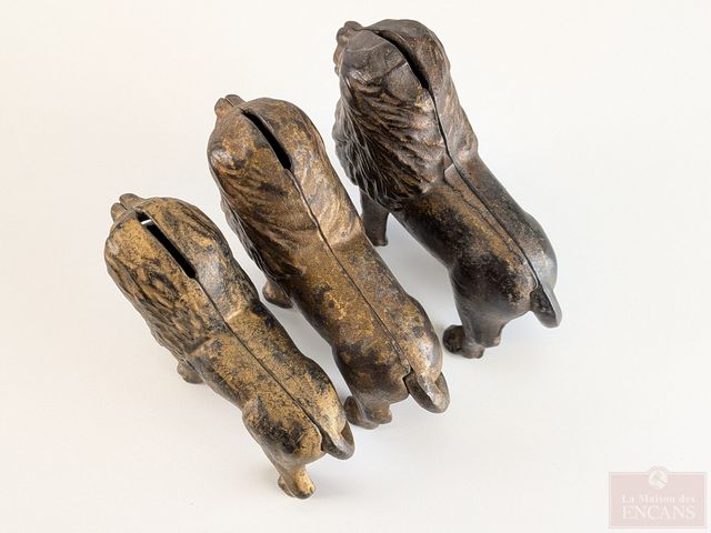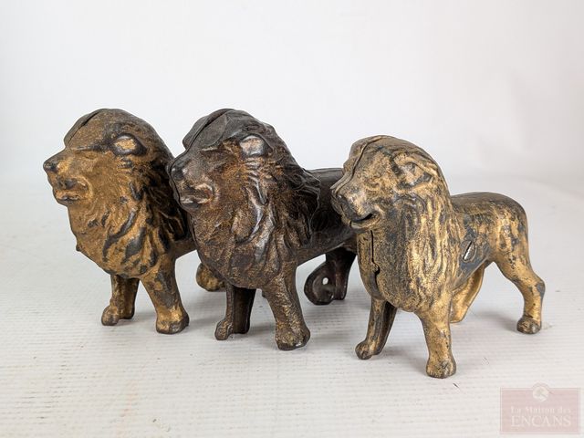 Lot # 51 - Trois anciennes tirelires en métal représentant des lions, la plus grande mesurant 5 pouces de largeur