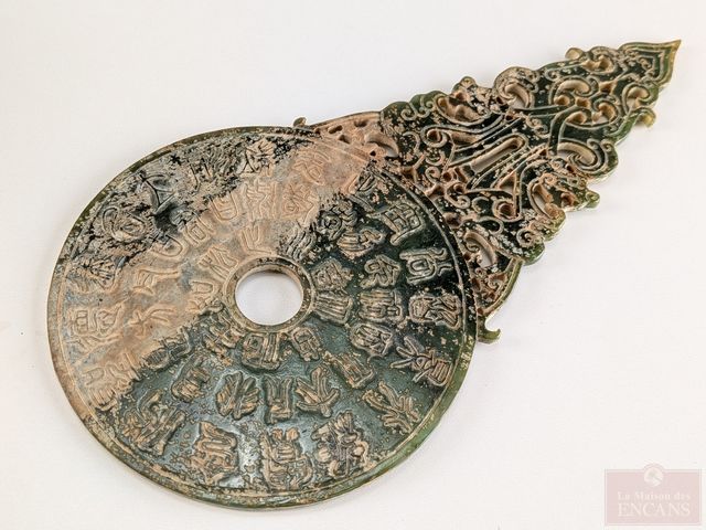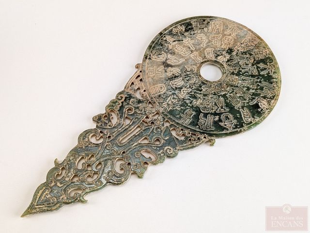 Jade chinois finement sculpté à motifs de dragons et disque Bi, mesurant 9.75 pouces de longueur