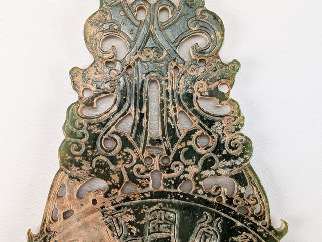 Lot # 94 - Jade chinois finement sculpté à motifs de dragons et disque Bi, mesurant 9.75 pouces de longueur SOLD