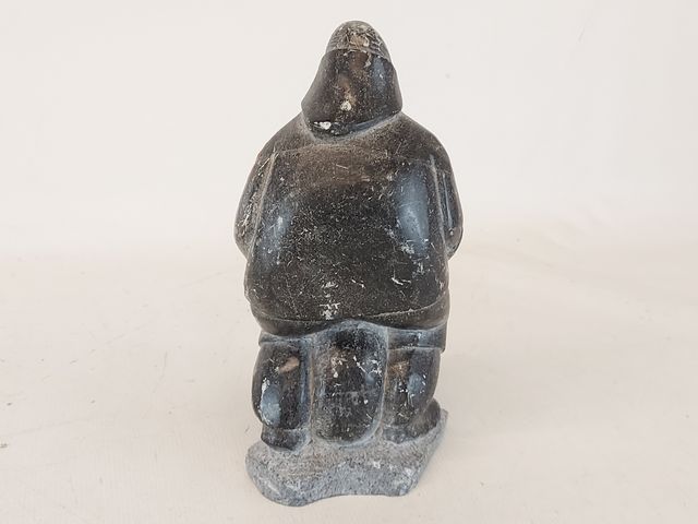 Lot # 23 - Sculpture inuit sur pierre à savon signée - représentant un inuit tenant un phoque - mesurant 8.5 pouces de hauteur SOLD
