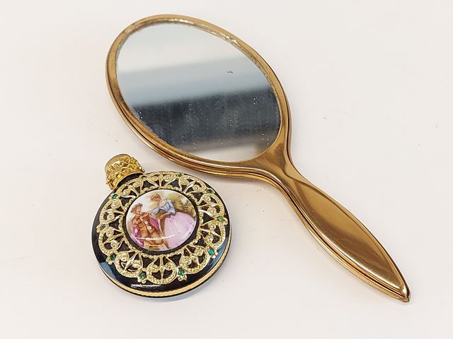 Lot # 102 - Petit ensemble de beauté Limoges pour sac de soirée comprenant miroir et parfumeuse - le miroir mesurant 4.75 pouces SOLD