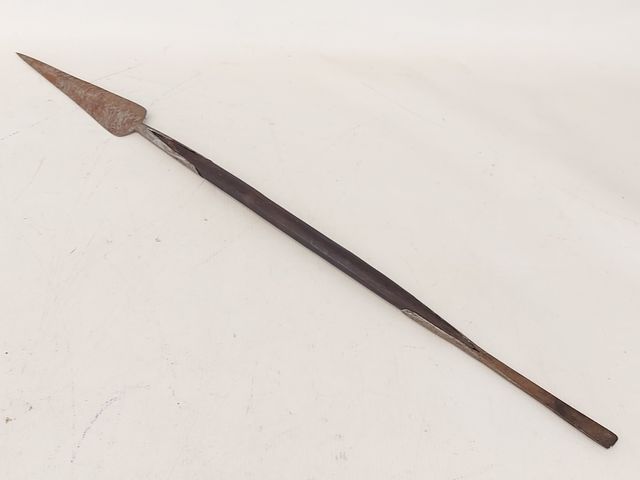 Lot # 223 - Très jolie arme ancienne de combat rapproché zoulou ayant les caractéristiques d'une lance à double lames très courte utilisée par les guerriers comme un long couteau. Circa 1900 en excellente condition pour l'âge. Arme inventée par le roi Chaka Zoulou mesurant 20.5 de longueur VENDU