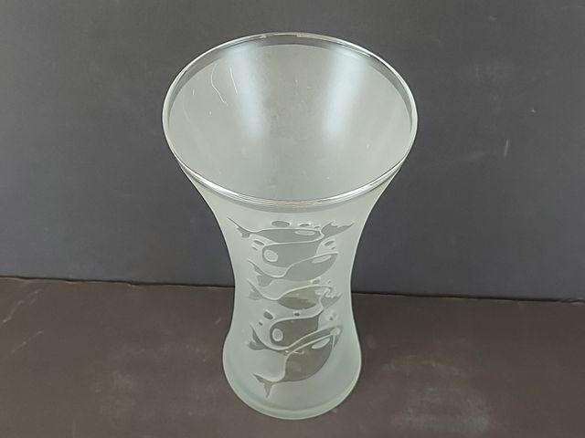 Lot # 127 - Vase en verre signé motifs de poissons mesurant 9.5 pouces de hauteur SOLD