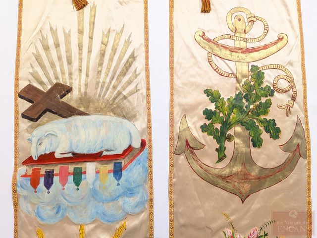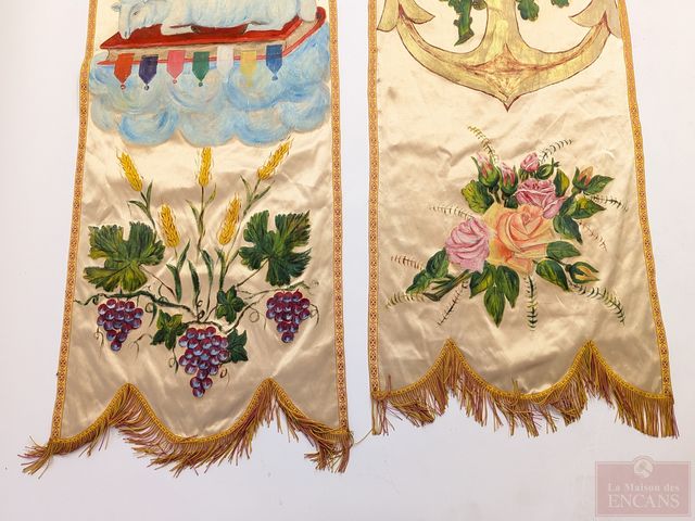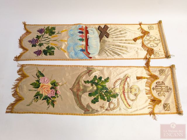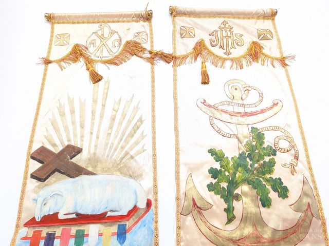 Lot # 134 - Deux bannières d'église en soie, peintes à la main et mesurant 69x20 pouces chacune, avec supports en bois et laiton SOLD
