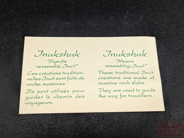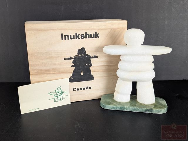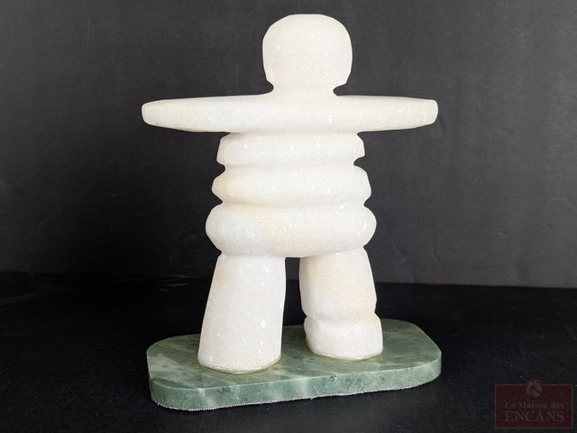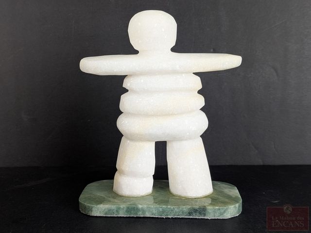 Lot # 227 - Inukshuk sculpté sur quartz avec base en serpentine, mesurant 5.5 pouces de hauteur, dans sa boite SOLD