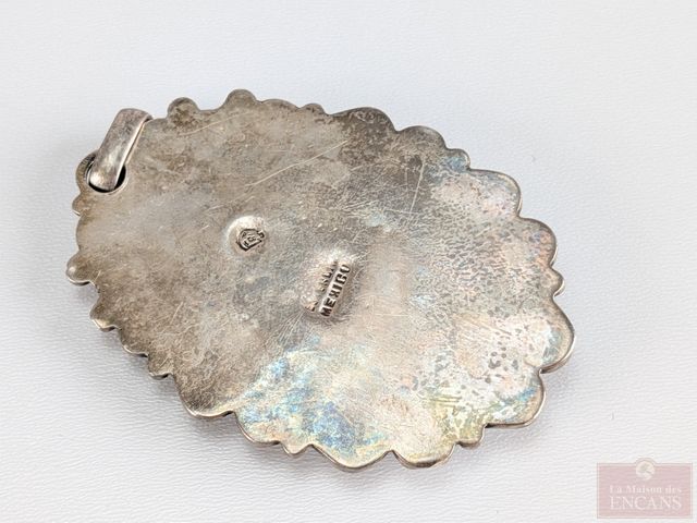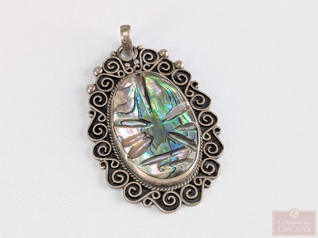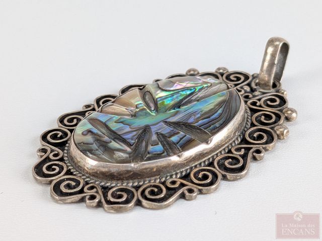 Lot # 200 - Pendentif en argent serti de nacre de perle sculpté, mesurant 2.5 pouces de longueur SOLD