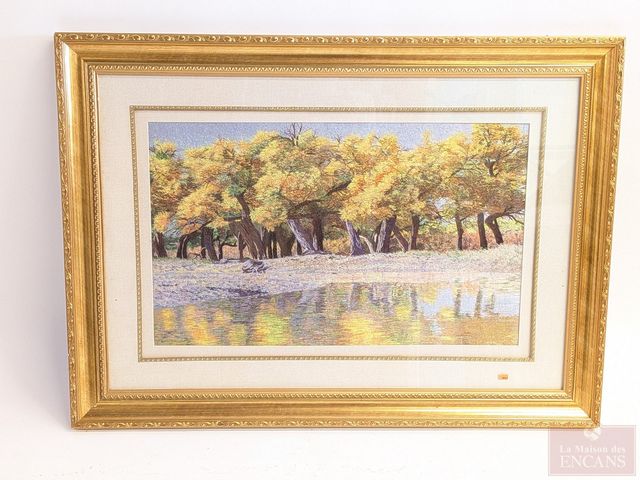 Lot # 162 - Tapisserie orientale en soie, mesurant 18x30 pouces, dans un joli encadrement doré mesurant 31x43 pouces CANCELLED