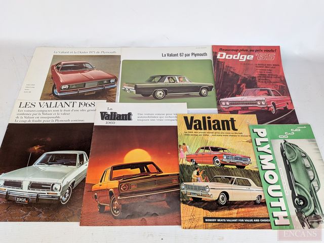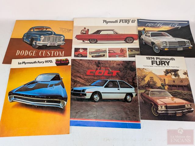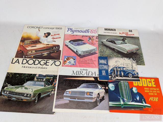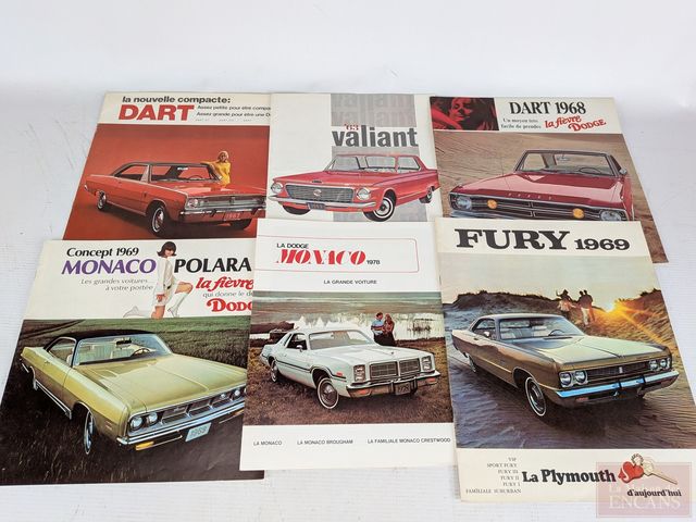 Lot # 124 - Lot de brochures automobiles comprenant Plymouth Fury 1967, 1969, 1970, 1974, 1978, Chrysler Coronet 1969, Plymouth 1938, 1965, Dodge Monaco 1969, 1978, Dodge Dart 1967, 1968, Valiant 1963, 1965, 1967, 1968, 1969, 1971, Doge Colt 1985 et autres SOLD