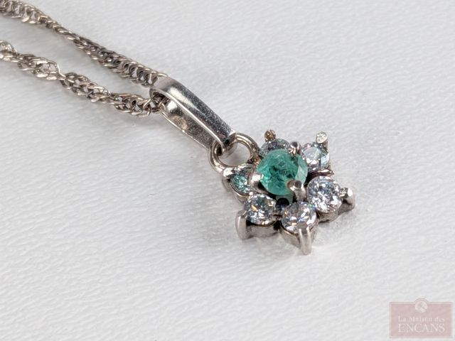 Chaine et pendentif en argent serti d'une émeraude de Colombie et de multiples pierres, la chaine mesurant 17.5 pouces de longueur