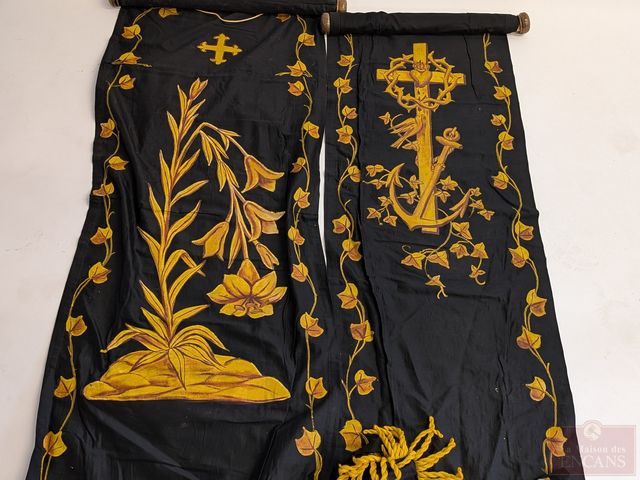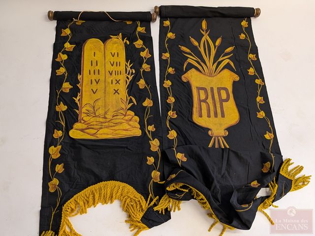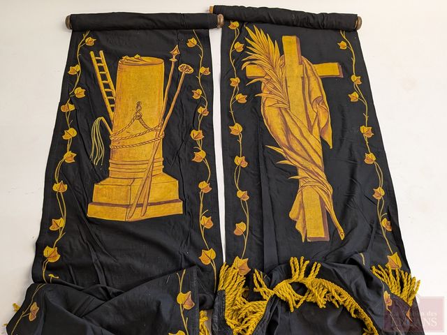 Lot # 238 - Lot de bannières religieuses utilisées pour cacher les statues durant la semaine sainte, faites en tissu et peintes à la main, mesurant 130 pouces de hauteur chacune, avec leurs supports en bois et laiton SOLD