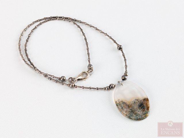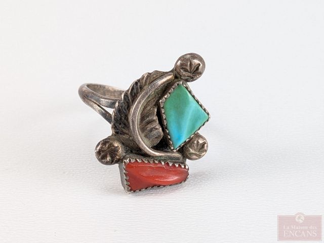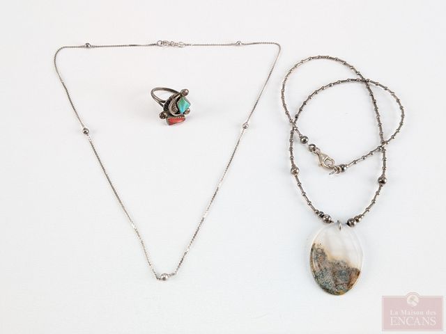 Lot # 192 - Lot de bijoux en argent, comprenant deux chaines, dont une avec agate mousse, la plus grande mesurant 15 pouces de longueur et une bague navajo de taille 6.75, sertie de corail et turquoise SOLD