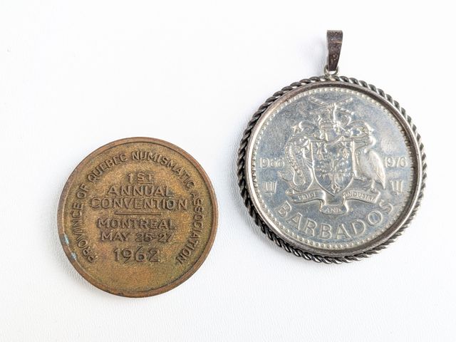 Lot # 48 - Gros lot de pièces de monnaies internationales, canadiennes, américaines et autres, comprenant approximativement 26 pièces canadiennes d'un dollar, dont confédération, approximativement 40 pièces canadiennes de cinquante sous, dont jubilée, pièces canadiennes de cinq sous, pièces canadiennes d'un sous, pièces américaines de cinquante sous, pièces françaises et internationales, jeton de la première Convention Annuelle de l'Association Numismatique du Québec par la Banque de Montréal en 1962, ainsi qu'une pièce montée sur pendentif en argent SOLD