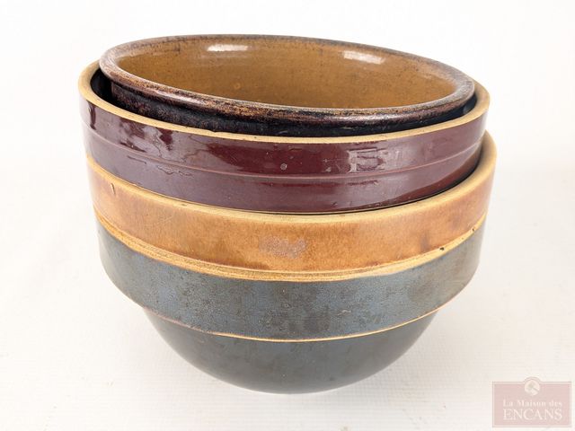 Lot d'anciens bols à mélanger en terre-cuite, dont un bol McCoy fait aux États-Unis, le plus grand mesurant 9 pouces de diamètre