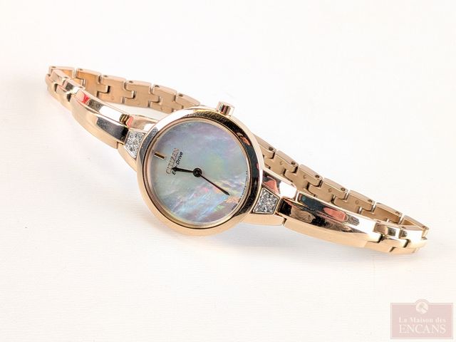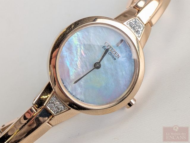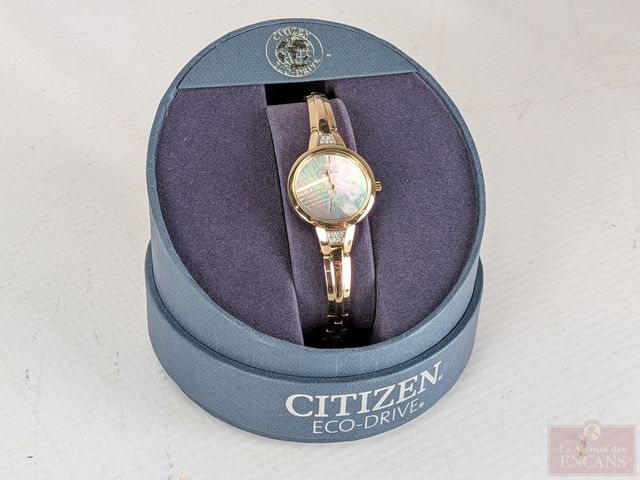 Montre Citizen Eco Drive pour dame avec façade en nacre de perle, mesurant 27.8 millimètres avec sa couronne, dans sa boite