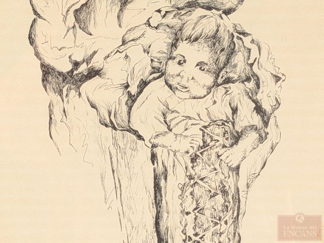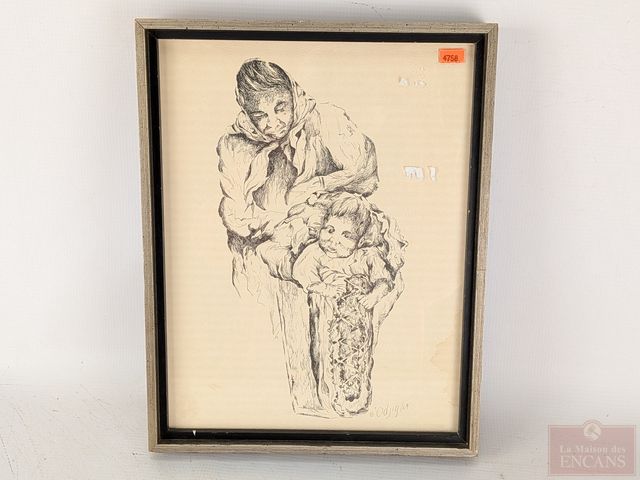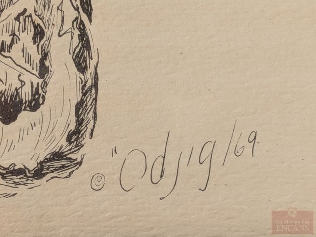 Lot # 72 - Daphnée ODJIG (1919-2016) - Dessin à l'encre signé, datant de 1969 et mesurant 12.5x9.5 pouces