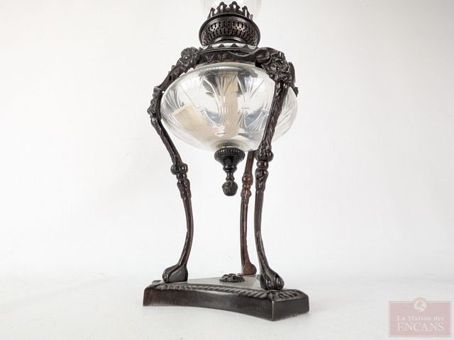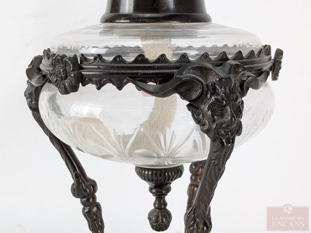 Lampe à l'huile en bronze et verre ciselé avec motifs de gargouilles, mesurant 23 pouces de hauteur