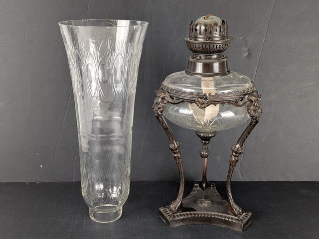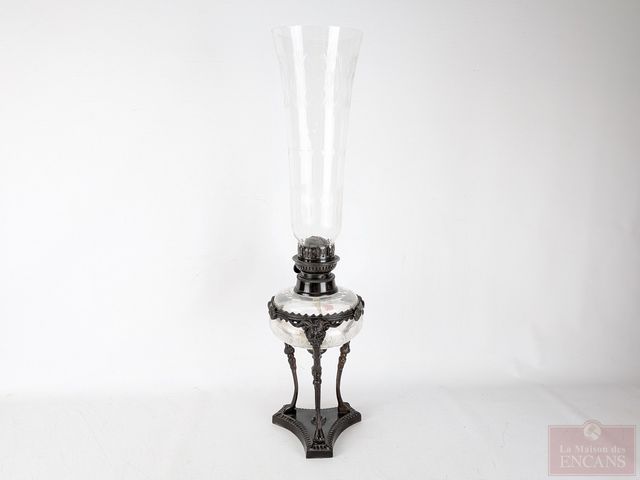 Lot # 185 - Lampe à l'huile en bronze et verre ciselé avec motifs de gargouilles, mesurant 23 pouces de hauteur