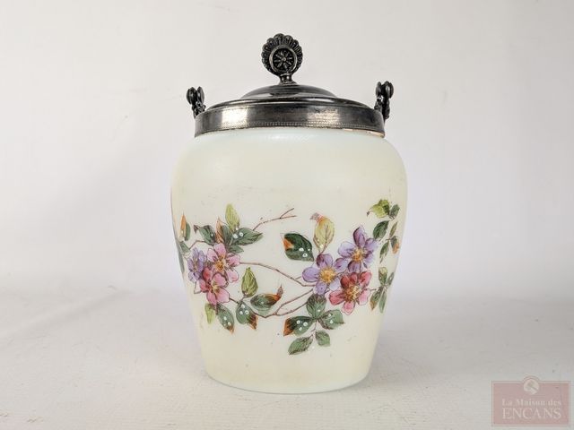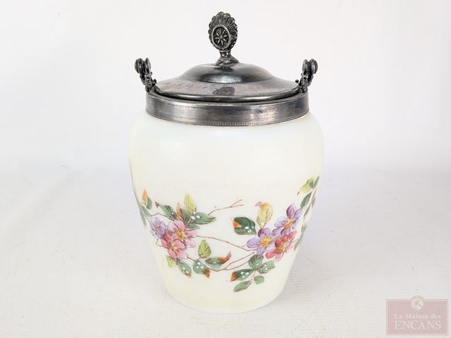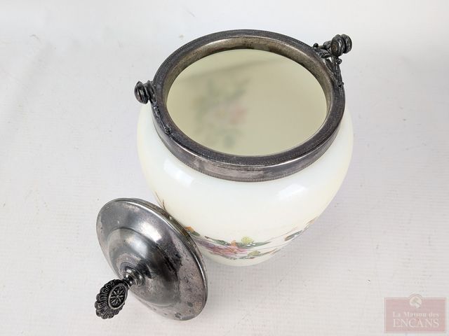 Lot # 191 - Jarre à biscuits en céramique avec couvercle et anse en métal, peinte à la main et mesurant 8 pouces de hauteur
