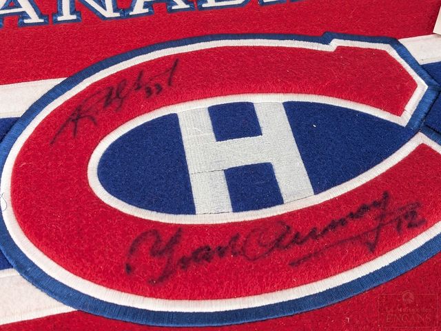 Lot # 17 - Bannière des Canadiens de Montréal signée par Yvan Cournoyer et Richard Sévigny, ainsi que deux cartes de la tournée des anciens Canadiens autographiées