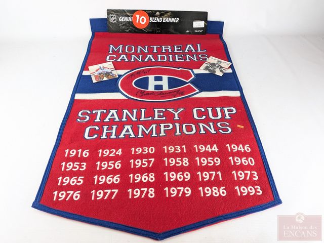 Bannière des Canadiens de Montréal signée par Yvan Cournoyer et Richard Sévigny, ainsi que deux cartes de la tournée des anciens Canadiens autographiées