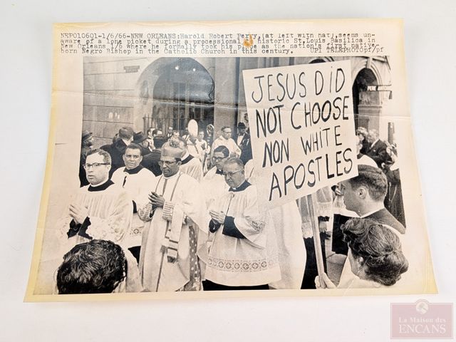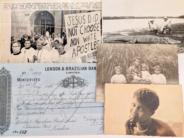 Lot # 117 - Lot historique comprenant photo de presse d'une manifestation du premier évêque noir de l'église catholique du diocèse de la Nouvelle-Orléans lors de la procession de la basilique Saint-Louis, en Nouvelle-Orléans, datant de 1966, avec photographie d'une chasse aux crocodiles et autres photos, ainsi qu'un chèque de la London and Brazilian Bank datant de 1896