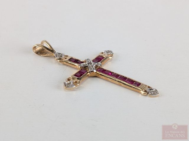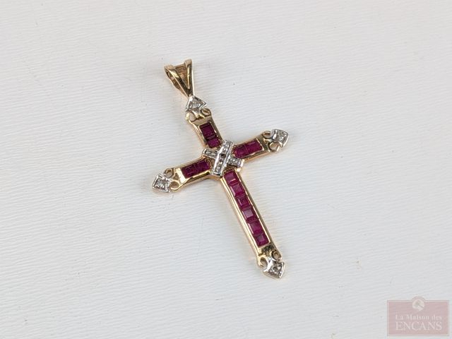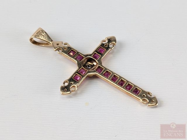 Lot # 151 - Croix en or 10k sertie de rubis et de diamants, mesurant 1.25 pouces de hauteur