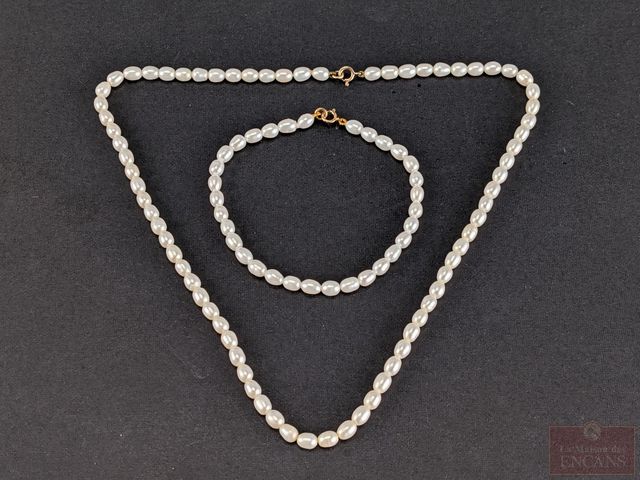 Collier de perles avec fermoir en or 10k, mesurant 16 pouces de longueur, ainsi que bracelet de perles avec fermoir en or 10k mesurant 6 pouces de longueur