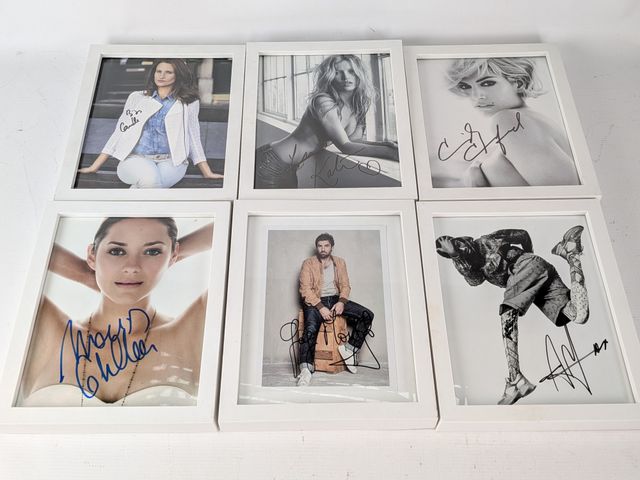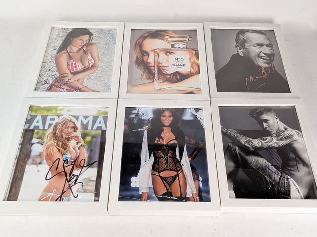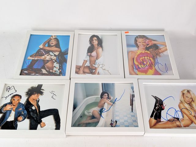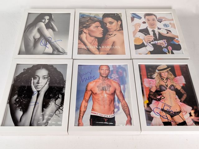 Gros lot de photos de célébrités autographiées, comprenant Winnie Harlow, Monica Bellucci, Heidi Klum, Pamela Anderson, Jimmy Fallon, Miranda Kerr, Justin Beiber, Lily-Rose Depp et autres, ainsi qu'un magazine Rolling Stone signé par Claudia Schiffer
