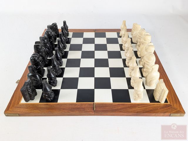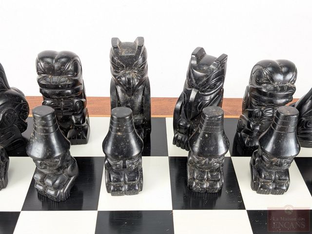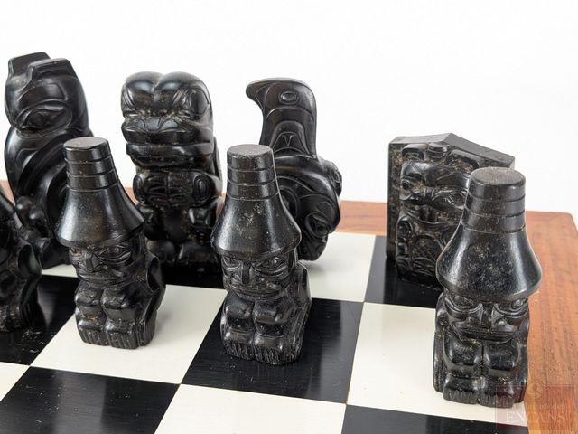 Lot # 171 - Jeu d'échec et pièces à motifs autochtones haïda d'après Christian White, provenant du musée de l'Histoire du Canada, l'échiquier mesurant 17.5x17.5 pouces et les plus grandes pièces mesurant 3 pouces de hauteur