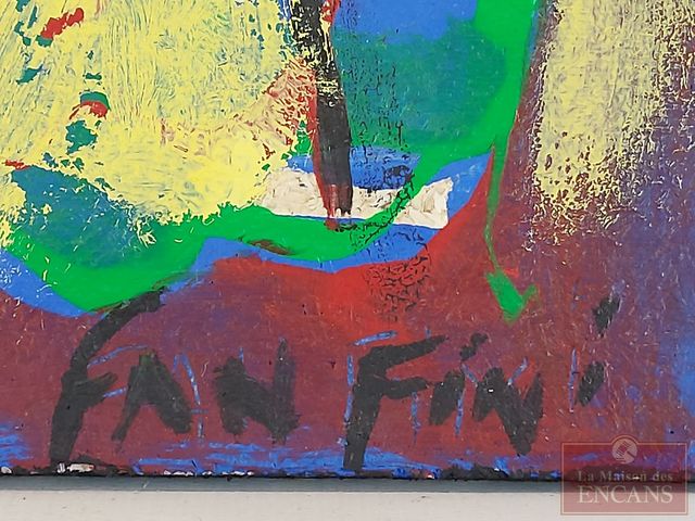 Lot # 161 - Fan Fini - Acrylique sur panneau signée et titrée Coquines mangeuses de laitue frisée - mesurant 10.75x7 pouces VENDU