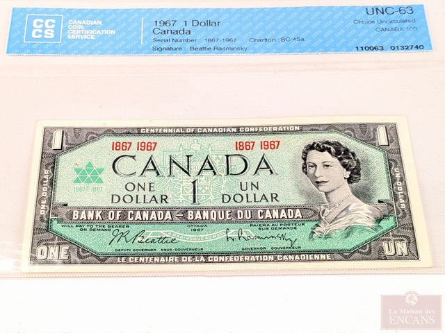 Lot # 219 - Billet canadien d'un dollar 1967, gradé UNC-63
