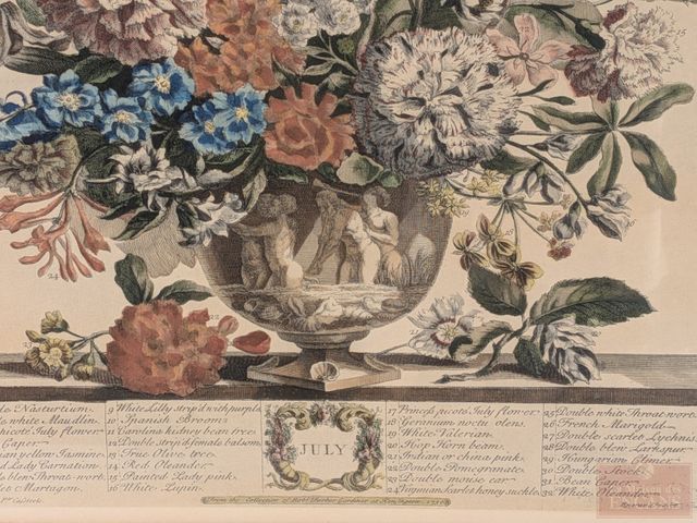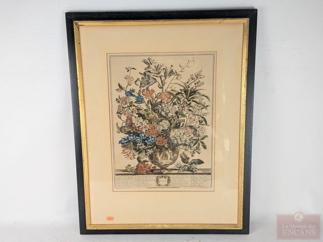 Lot # 131 - Ancienne eau-forte aquarellée à la main, représentant les fleurs du moi de juillet et mesurant 16x12 pouces, dans un encadrement doré à la feuille d'or