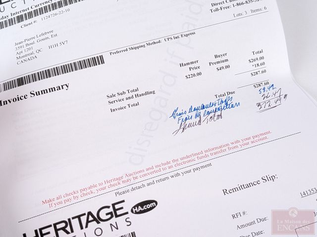 ''HISTORIQUE'' DES PRÉ-OFFRES: Lorsque vous faite une préoffre maximale, si un autre client mise le même montant que vous, le lot vous sera atribué et ce sans mention qu'une autre personne a misé le même montant. Il en va de même en cas de mise par téléphone égalisant votre mise maximale. En cas de doute SVP nous contacter au 514-255-5333.