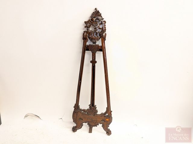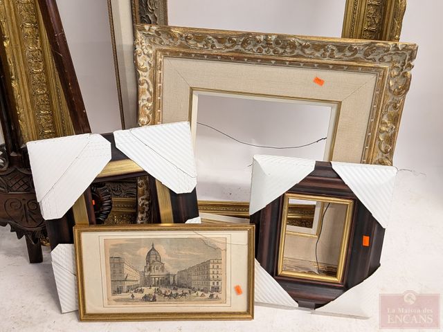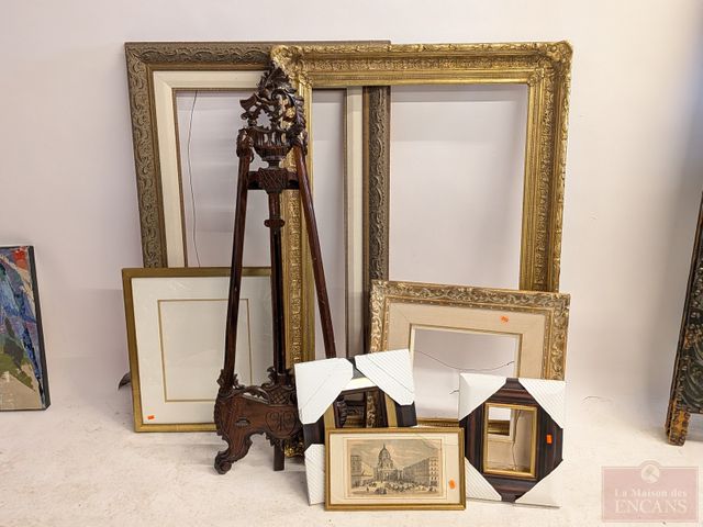 Lot varié comprenant chevalet, gravure rehaussée à la main mesurant 6x9.5 pouces et encadrements en bois, le plus grand mesurant 42x26 pouces