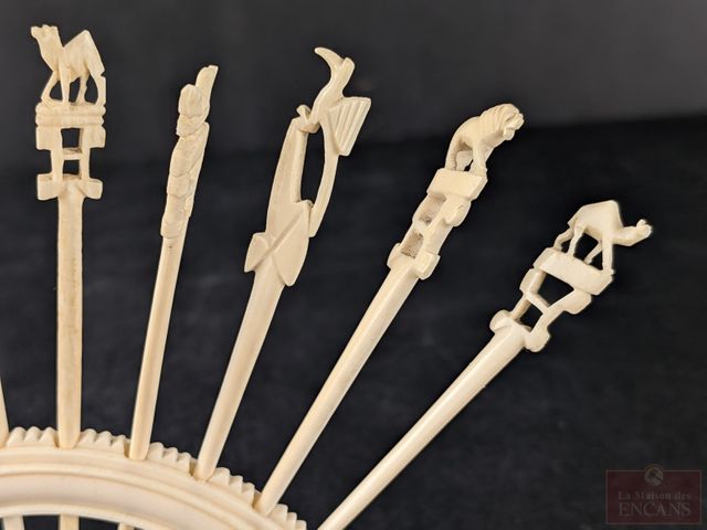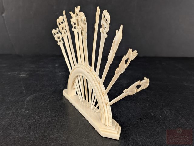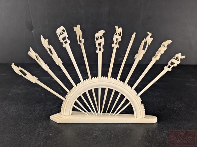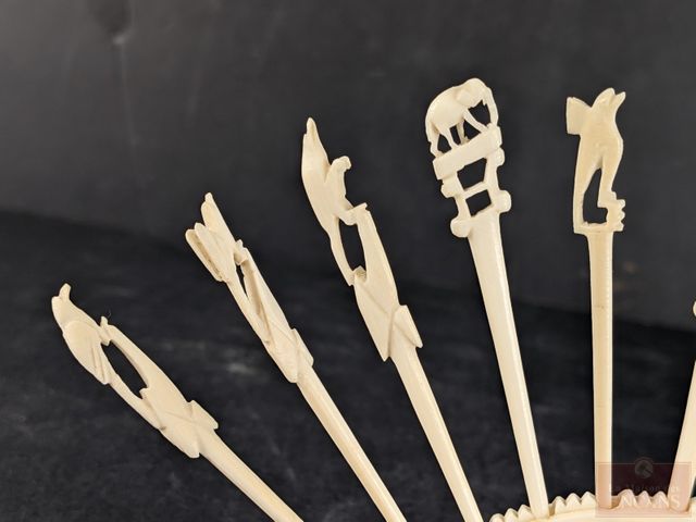 Lot # 217 - Ensemble porte-cure-dents et cure-dents sculptés sur ivoire avec motifs d'animaux, circa 1950, mesurant 4 pouces de hauteur