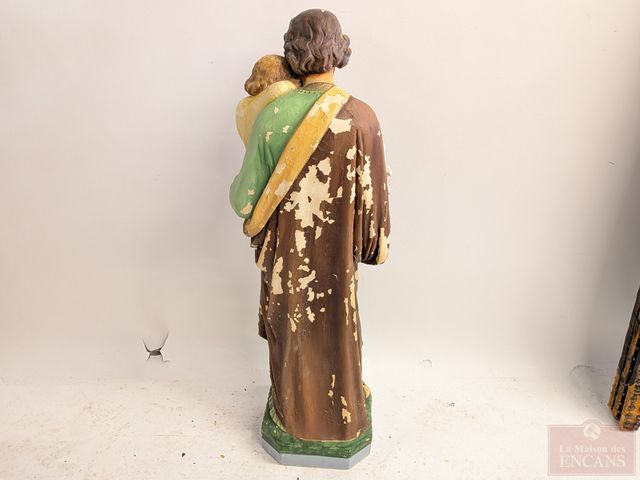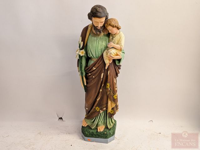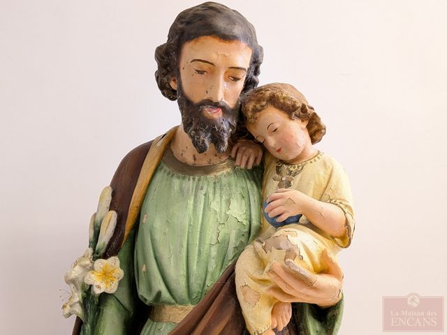 Plâtre représentant Saint-Joseph et l'enfant Jésus, peint à la main et mesurant 37 pouces de hauteur