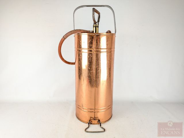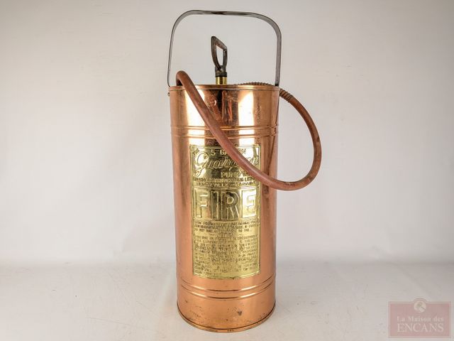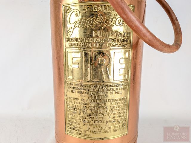 Extincteur militaire de cinq gallons en cuivre, fait par Manufacture Guardian, Brockville Canada, datant des années 1940 et mesurant 26 pouces de hauteur