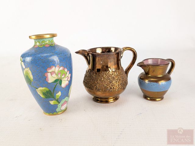 Lot # 62 - Lot comprenant un vase et deux pichets miniatures en porcelaine émaillée, le plus grand mesurant 4 pouces de hauteur
