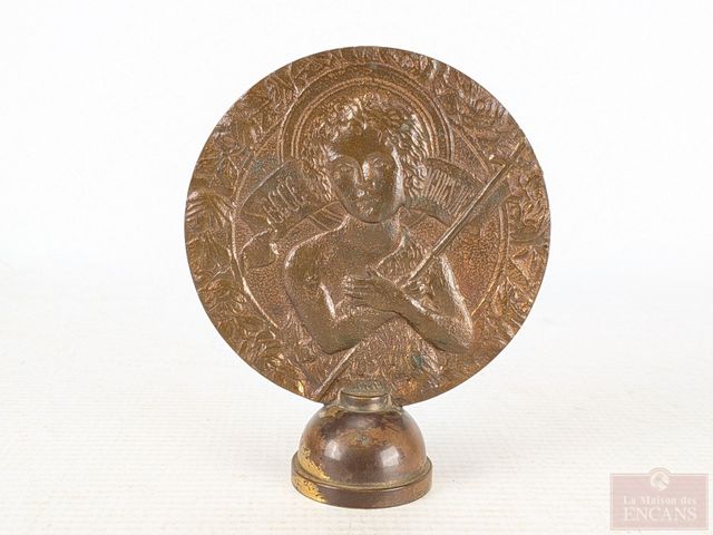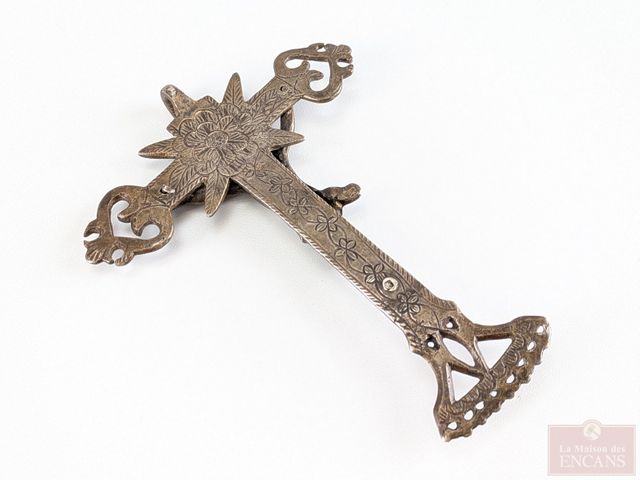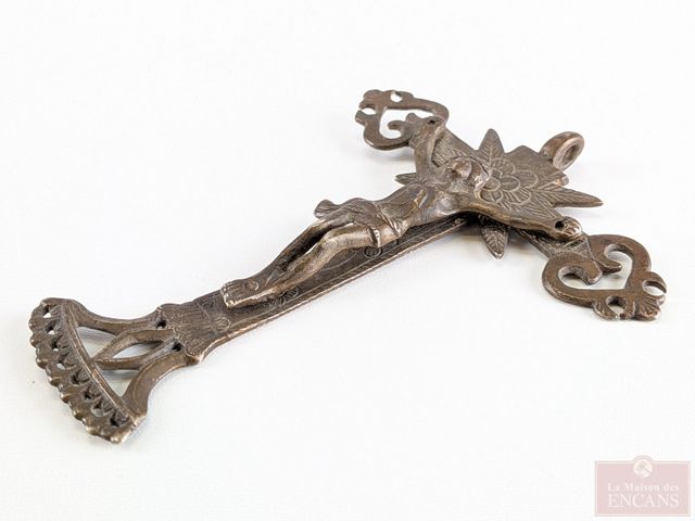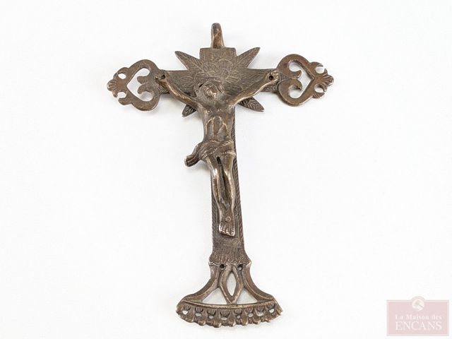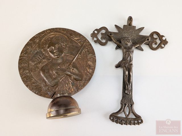 Lot # 233 - Garniture de bannière en bronze représentant Saint-Jean Baptiste, ainsi qu'un crucifix datant du 19eme siècle et mesurant 5.5 pouces